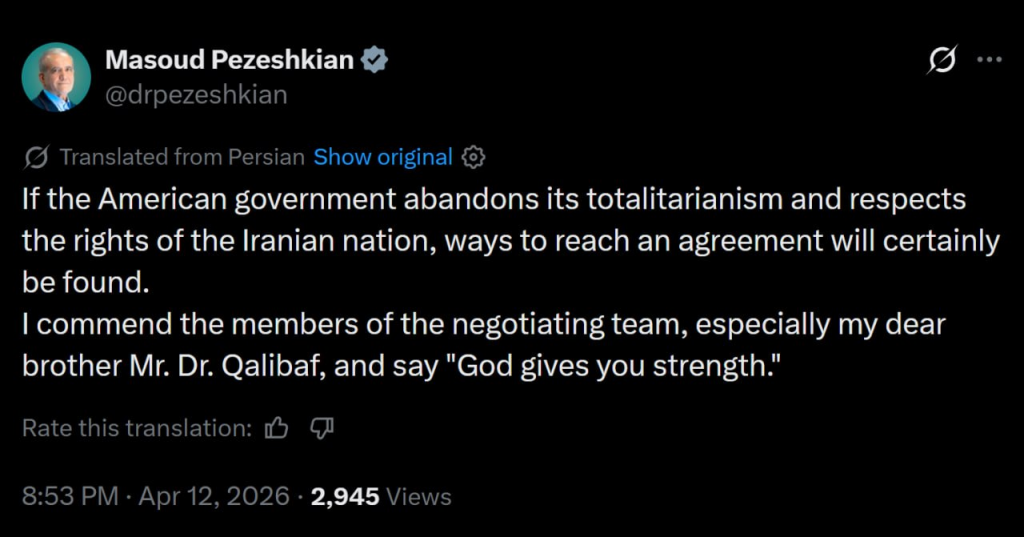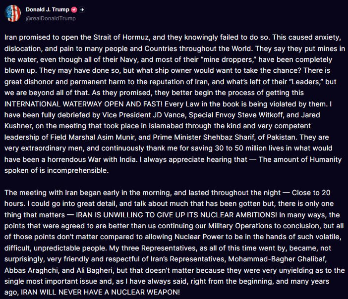Regional countries are racing to bring the US and Iran back to the negotiating table after marathon peace talks in Islamabad ended without a deal, reported the WSJ: “Despite defiant statements from the US and Iran, the door remains open for further diplomacy and a second round of talks could be held within days. Regional countries are also in consultation with the US to secure an extension of the two-week ceasefire.”