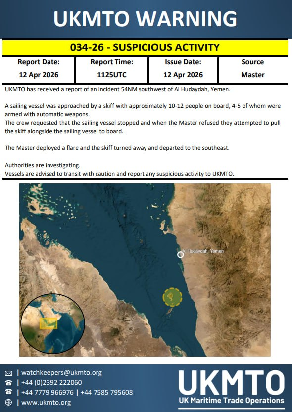 UKMTO reported that a vessel 54 nautical miles southwest of Al Hudaydah, Yemen, in the area of the Bab el-Mandeb Strait, was approached by a skiff carrying 10-12 individuals, 4-5 of whom were armed with automatic weapons, however, as the group attempted to stop and board the ship, the crew fired a flare, prompting the attackers to withdraw and leave the area.