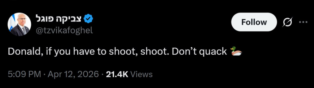Chairman of the Knesset’s National Security Committee Zvika Fogel left a short message on X, saying: “Donald, if you have to shoot, shoot. Don’t quack.”