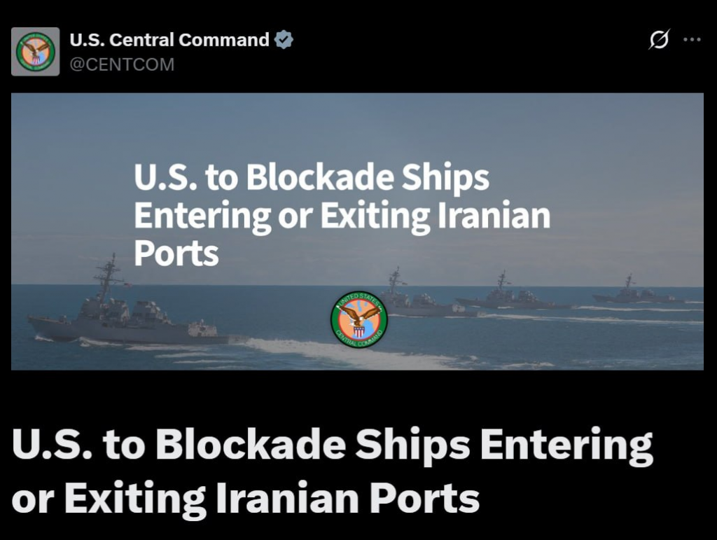 US Central Command announced that the United States will begin a naval blockade of all ships entering or leaving the Iranian ports on April 13 at 10am Eastern Time: “The blockade will be enforced impartially against vessels of all nations entering or departing Iranian ports and coastal areas, including all Iranian ports on the Arabian Gulf and Gulf of Oman. CENTCOM forces will not impede freedom of navigation for vessels transiting the Strait of Hormuz to and from non-Iranian ports.”