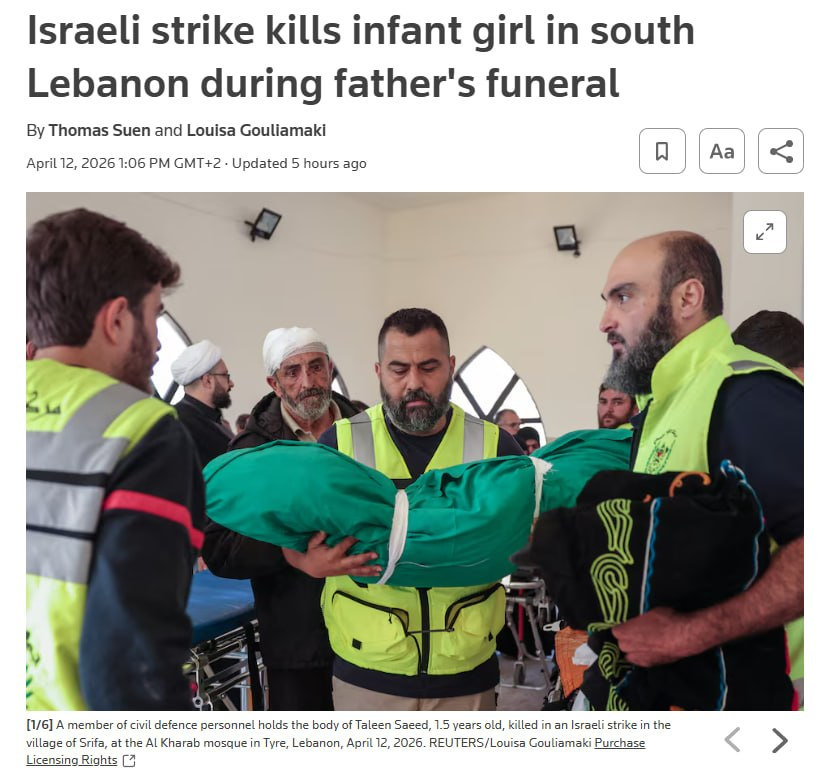 An Israeli strike in southern Lebanon killed a 1-and-a-half year old girl along with several of her relatives as they gathered for her father’s funeral in Srifa, in an attack which occurred on the first day of the US-Iran ceasefire that many had hoped would include Lebanon, Reuters reported.