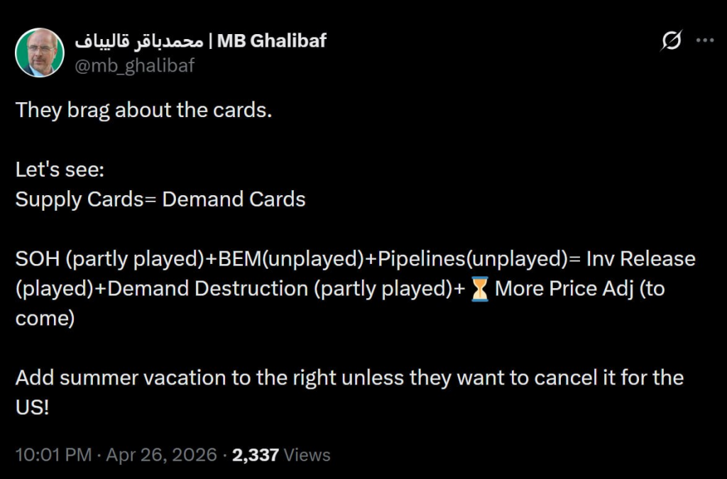 Iran: Parliament Speaker Mohammed Bagher Ghalibaf wrote a cryptic message on X, appearing to warn that summer could be cancelled in the US if the war continues.