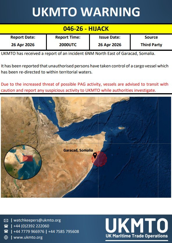 Somalia: UKTMO reported unauthorised persons had taken control of a large cargo vessel six nautical miles of Garacad, Somalia, and then redirected it to within Somalian waters.
