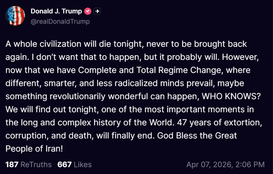 At around 8am Washington time (3pm Israel time), approximately 12 hours to the deadline, Trump took to Truth Social: “A whole civilisation will die tonight, never to be brought back again. I don’t want that to happen, but it probably will. However, now that we have Complete and Total Regime Change, where different, smarter, and less radicalised minds prevail, maybe something revolutionarily wonderful can happen, WHO KNOWS? We will find out tonight, one of the most important moments in the long and complex history of the world. 47 years of extortion, corruption, and death, will finally end. God Bless the Great People of Iran!”
