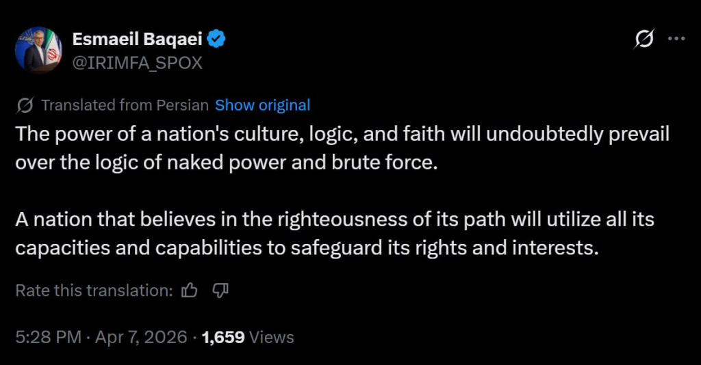 Foreign Ministry Spokesman for Iran, Esmaeil Baghaei, said the power of a nation’s culture, logic and faith would undoubtedly prevail over the logic of naked power and brute force – a nation that believes in the righteousness of its path will utilise its capacities and capabilities to safeguard its rights and interests.