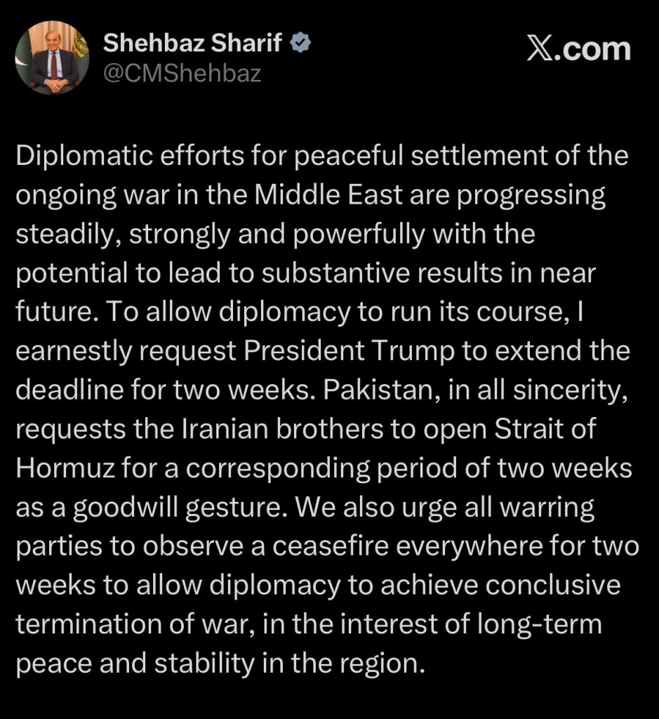 Pakistan PM Sharif asked Trump via X to extend his deadline for Iran in a desperate plea to prevent escalation: “Diplomatic efforts for peaceful settlement of the ongoing war in the Middle East are progressing steadily, strongly and powerfully with the potential to lead to substantive results in the near future. To allow diplomacy to run its course, I earnestly request President Trump to extend the deadline for two weeks,” he wrote, adding that: “We also urge all warring parties to observe a ceasefire everywhere for two weeks to allow diplomacy to achieve conclusive termination of the war, in the interest of long-term peace and stability in the region.”