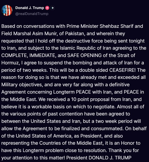 Soon after, Trump took to Truth Social to confirm that a ceasefire would take place once Iran had agreed to the complete, immediate, and safe opening of the Strait of Hormuz.