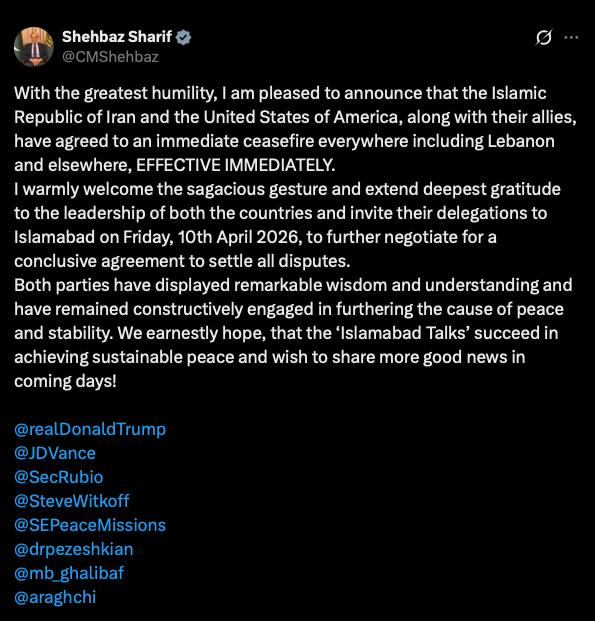 Pakistani Prime Minister Sharif announced an immediate ceasefire had been confirmed, taking effect across all fronts including Lebanon, welcoming the agreement as a significant step towards de-escalation, praising both sides for what was described as a ‘sagacious’ and constructive approach to ending hostilities.