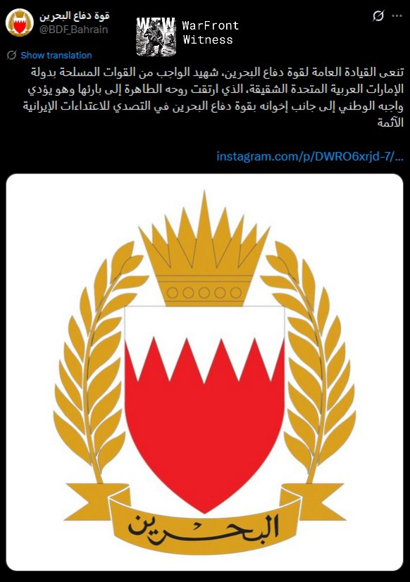 Bahrain Defence Ministry reported that a soldier was killed while responding to Iranian attacks, while several Bahraini and Emirati troops were wounded, but further details were not provided.