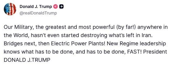 President Trump took to X before heading to bed for the night, saying: “Our Military, the greatest and most powerful (by far) anywhere in the World, hasn’t even started destroying what’s left in Iran. Bridges next, then Electric Power Plants! New Regime leadership knows what has to be done, and has to be done FAST!”