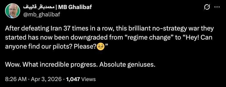 Iranian Parliament Speaker Ghalibaf took to X to mock the US: “After defeating Iran 37 times in a row, this brilliant no-strategy war that they started has now been downgraded from ‘regime change’ to ‘Hey! Can anyone find our pilots? Please? Wow. What incredible progress. Absolute Geniuses.”