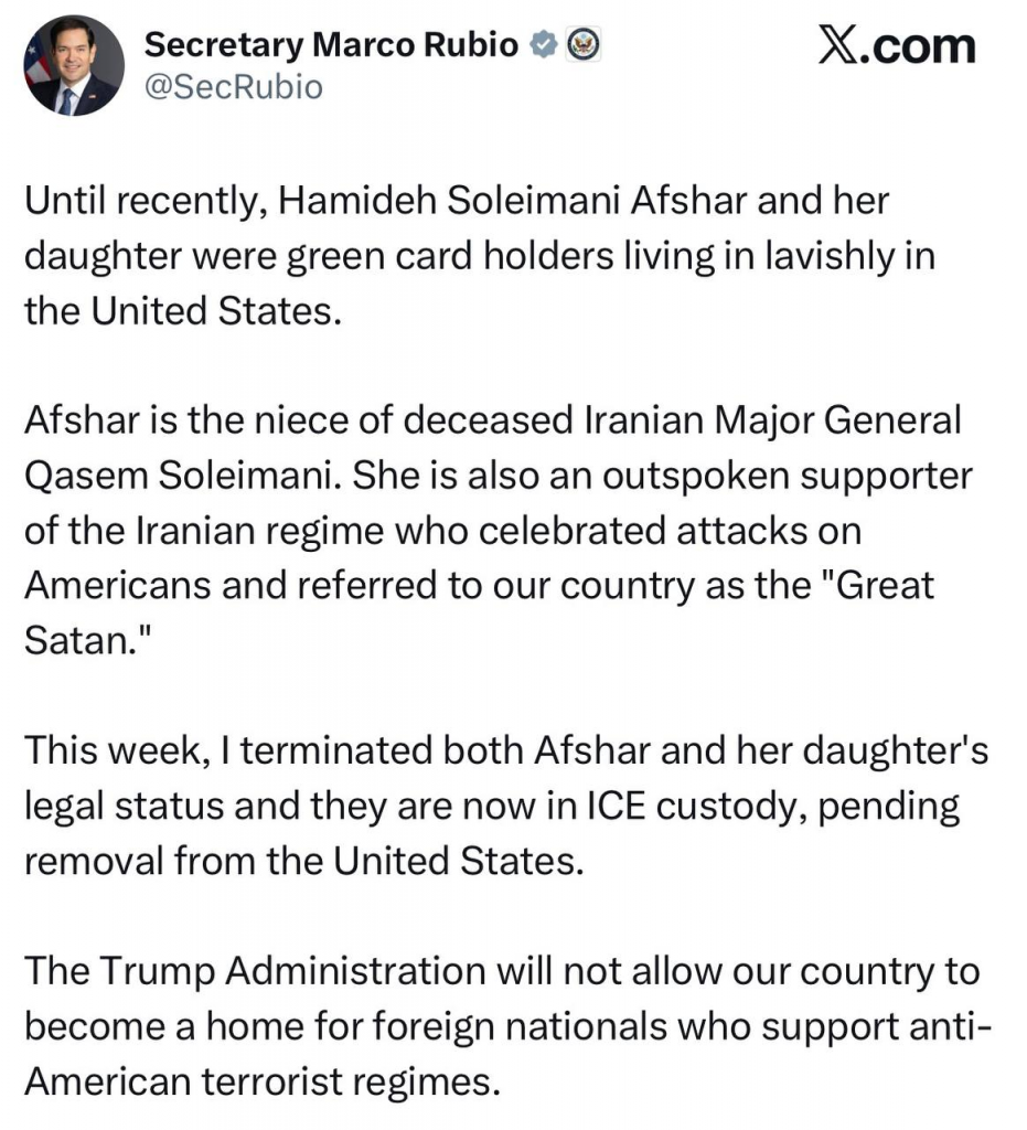 US Secretary of State Marco Rubio said that Hamideh Soleimani Afshar was an outspoken supporter of the Iranian regime who celebrated attacks on Americans and referred to the US as the ‘Great Satan,’ adding that the Trump Administration would not allow their country to become a home for foreign nationals who support anti-American terrorist regimes, however, Fars News Agency and other Iranian media later claimed there was no affiliation to the assassinated IRGC Quds Force Commander General Qassem Soleimani, as previously speculated.