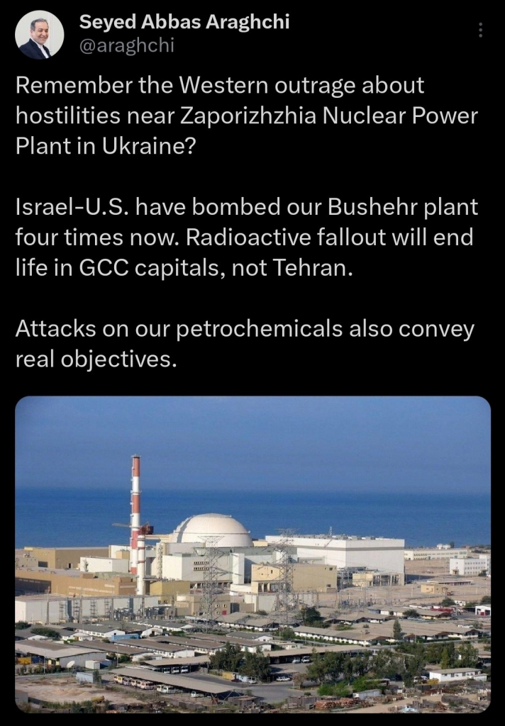 Iranian Foreign Minister Abbas Araghchi said: “Remember the outrage in the West over the fighting near the nuclear power plant in Zaporizhzhia, Ukraine? Israel and the US have bombed our facility in Bushehr already four times. Radioactive fallout will wipe out life in the capitals of the Gulf states, not Tehran. The attacks on our petrochemical facilities also reflects the real objectives.”